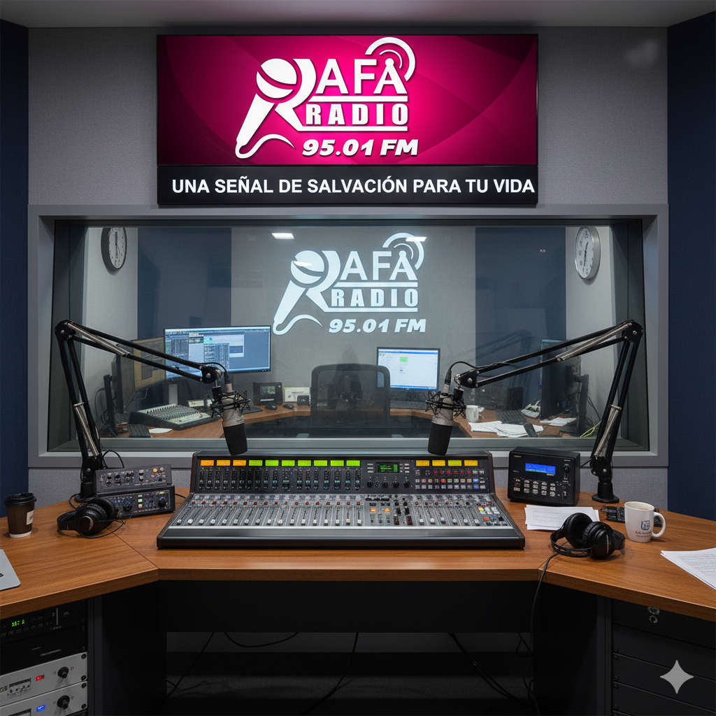 Explore our contemporary Christian radio studio, featuring Radio Rafa 95.01 on display.